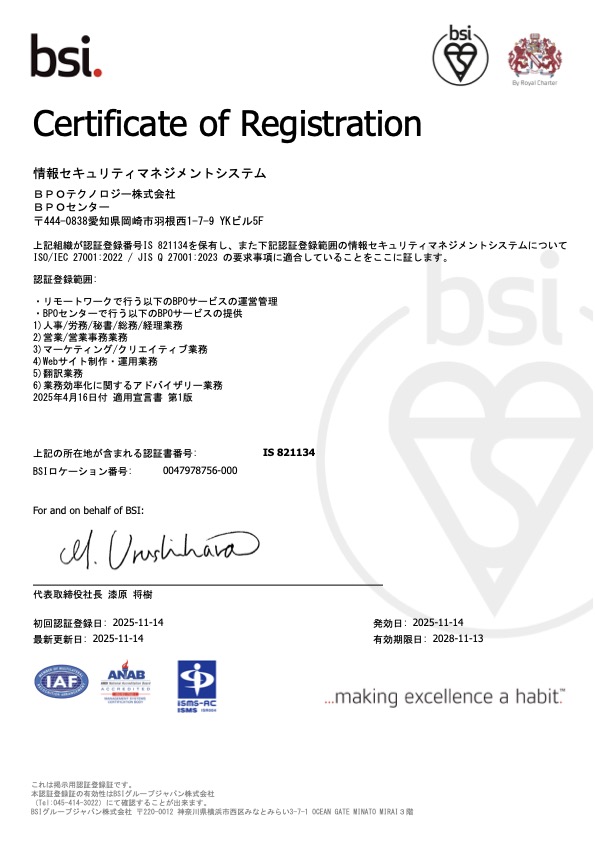 この度当社は、お客様の大切な情報資産を適切に管理し、安心してサービスをご利用いただける環境を提供するため、情報セキュリティマネジメントシステム(ISMS)の国際規格である「ISO / IEC 27001」の認証を、2025年11月14日付で取得いたしました。今回の取得を契機に、さらなる情報セキュリティの向上を図り、今後も安全で信頼性の高いサービスを継続的に提供してまいります。