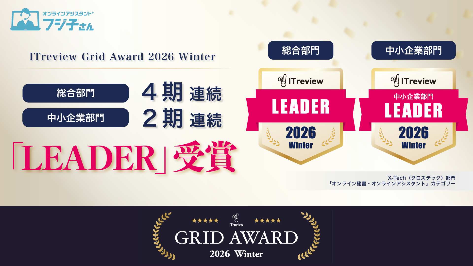 オンラインアシスタント®「フジ子さん」が、「ITreview Grid Award 2026 Winter」で2部門連続受賞