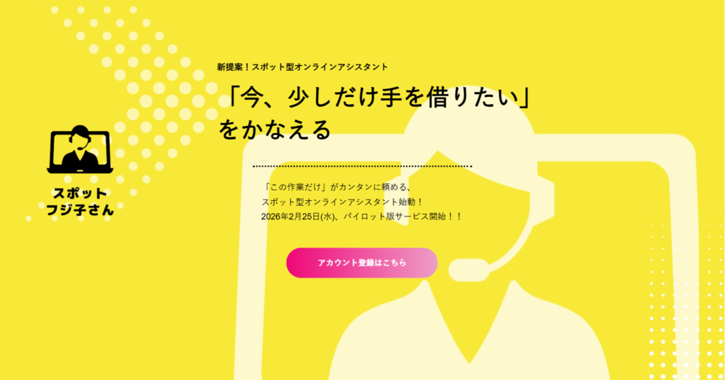 オンラインアシスタント®「フジ子さん」(https://fujiko-san.com/)を運営するBPOテクノロジー株式会社(本社:東京都中央区、代表取締役社長 山田真也、以下、「当社」)は、2026年2月25日(水)より、スポット型オンラインアシスタント「スポットフジ子さん」パイロット版の提供を開始いたします。